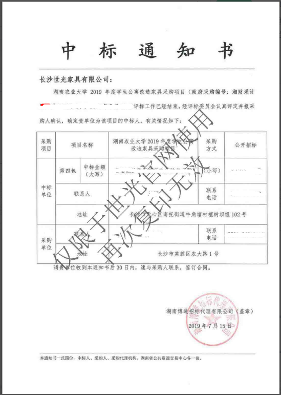湖南农业大学2019年度学生公寓改造家具采购项目
